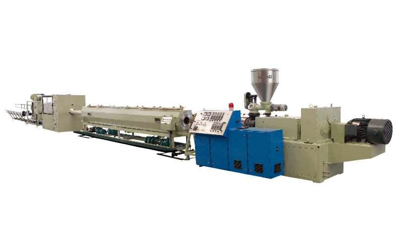 GF系列塑料管材生產線主要用于生產農用給排水、建筑給排水、線纜鋪設等方面的各種管徑、壁厚的塑料PVC管材,該機組由錐形雙螺桿擠出機、真空定型臺、牽引機、切割機、翻料架等組成。螺桿擠出機及牽引機采用進口交流變頻調速裝置,真空泵及牽引電機均采用優質產品。牽引有二爪、三爪、四爪、六爪等牽引方式。可選用鋸片或行星切割形式,另可帶計長及增厚裝置,機組性能可靠、生產效率高。本公司可根據客戶的要求,配置專用裝置生產螺旋消音管和芯層發泡管機組。